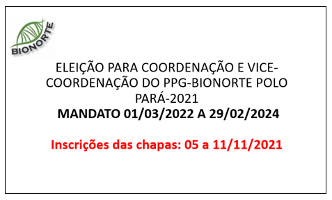 A Coordenação Estadual do Programa de Pós-Graduação em Biodiversidade e Biotecnologia - PPG-Bionorte, informa que estão abertas as inscrições das chapas para Coordenador e Vice-Coordenador do Programa. Para mais informações, consulte os procedimentos para inscrição aqui.
